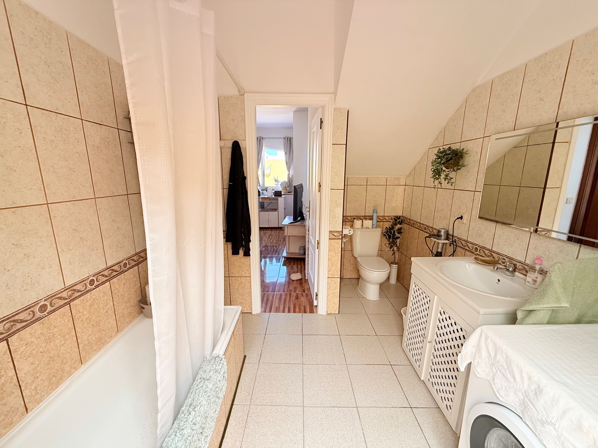 - Badezimmer mit Duschbadewanne, WC, Waschbecken, Waschmaschine