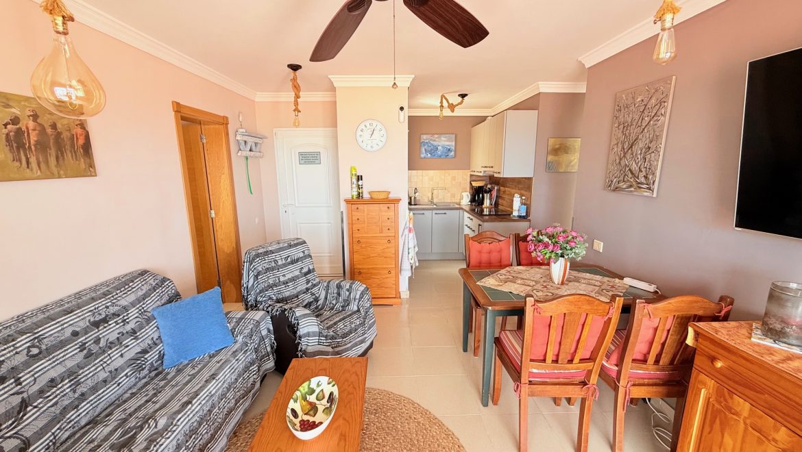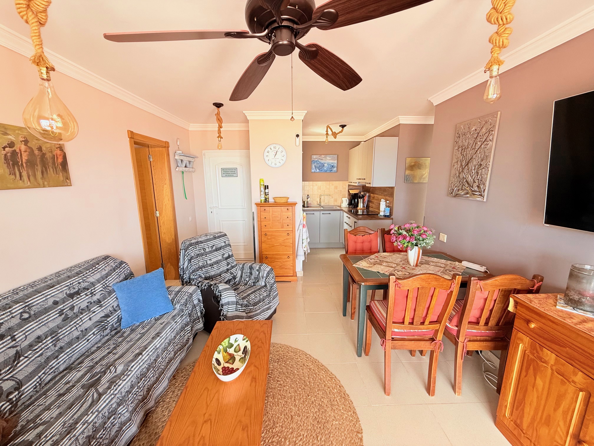 • Geräumiges Wohnzimmer mit Blick aufs Meer sowie Zugang zur Terrasse, Deckenventilatoren