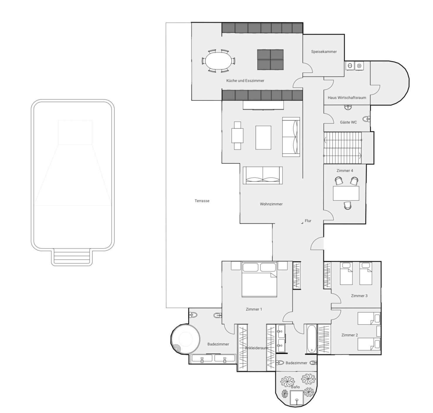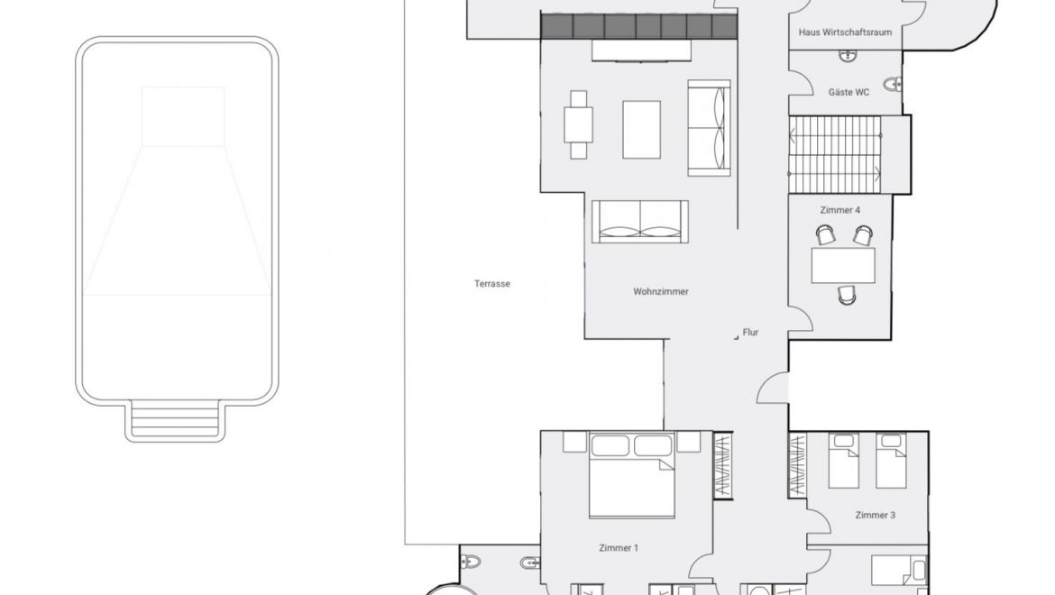 – 10x5m großer Infinity Pool mit Abdeckung, Gegenstromanlage, Whirlpool sowie integrierter Liegefläche - Hauswirtschaftsraum mit Waschmaschine und extra Wäscheraum (lufttrocknen)