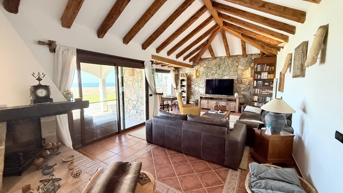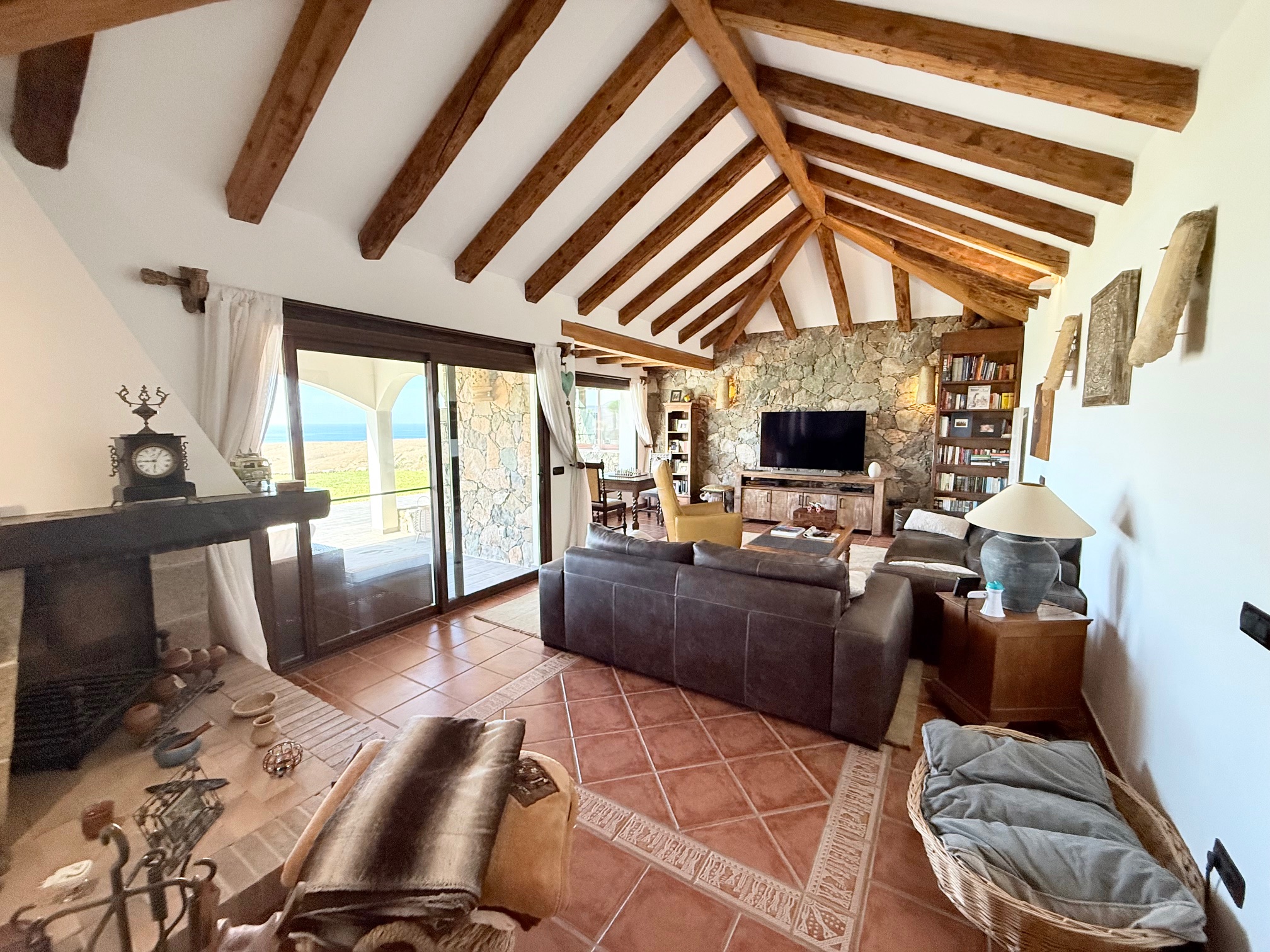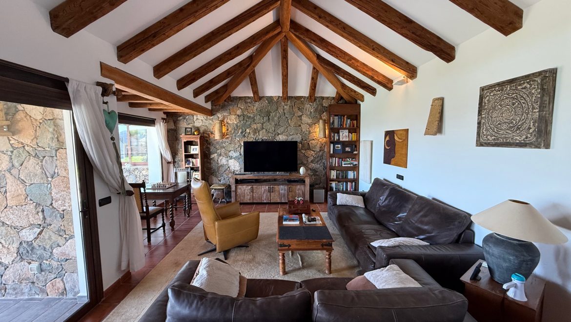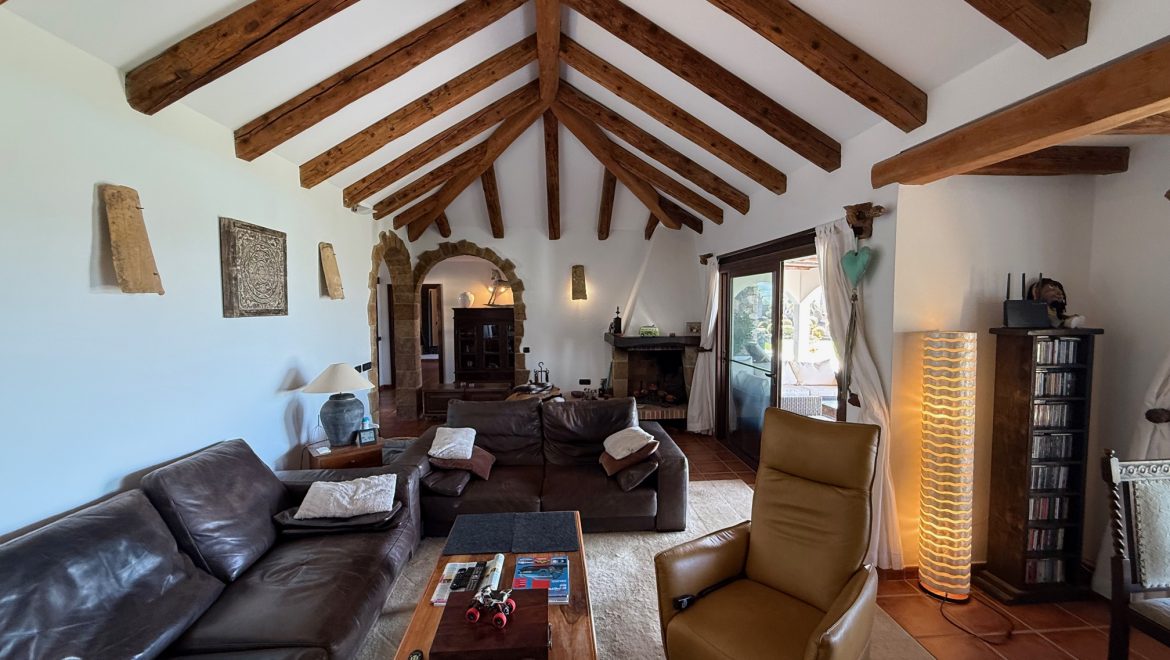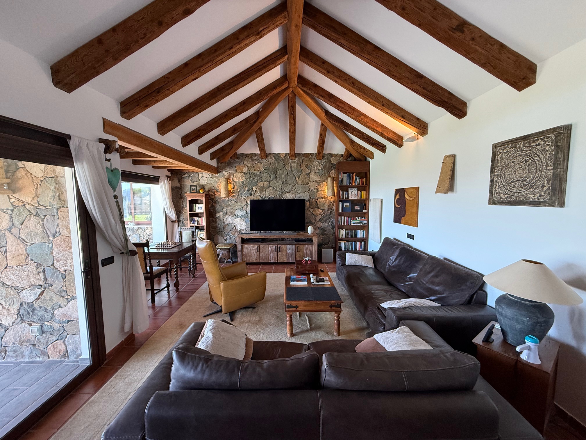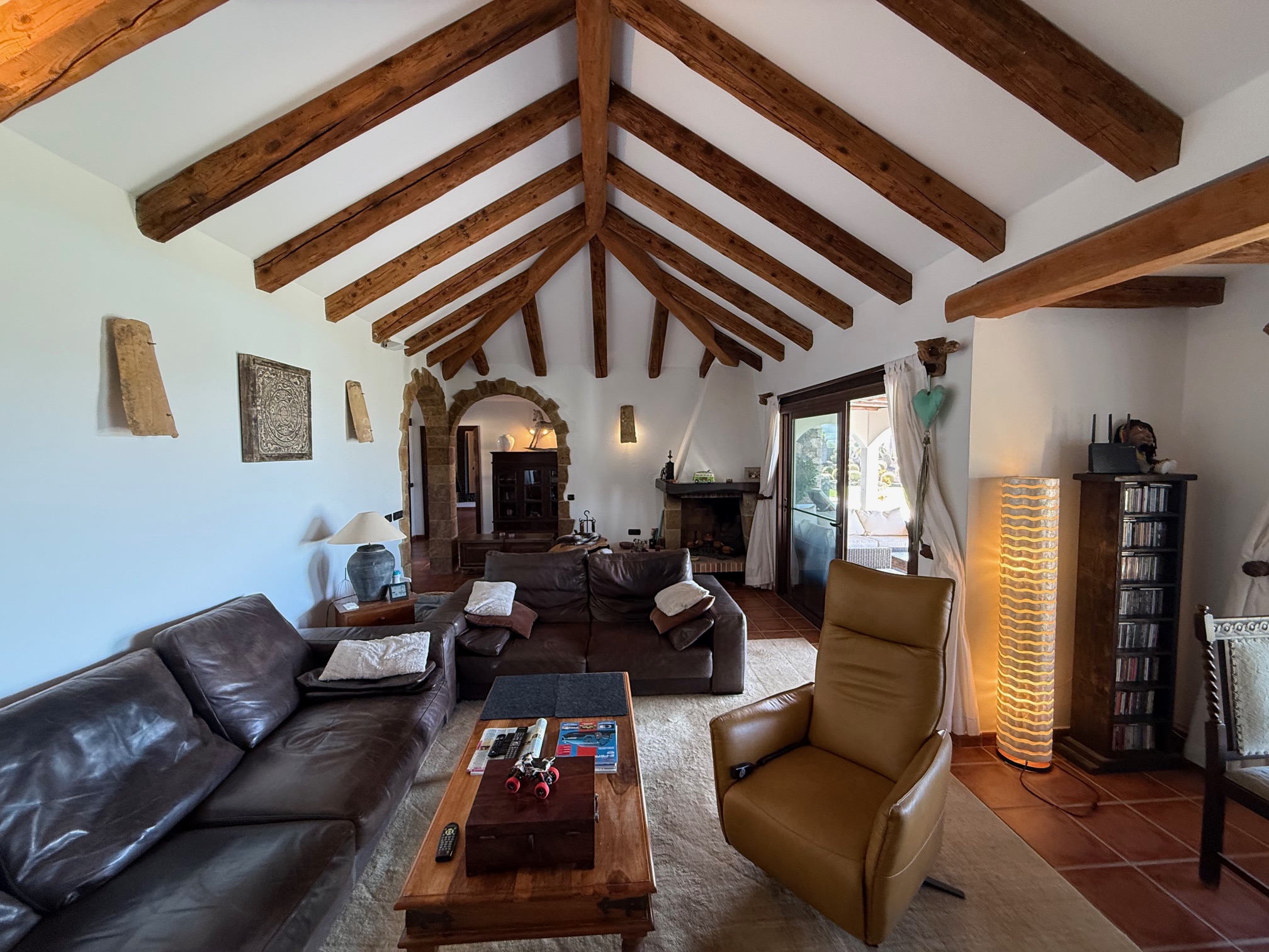 - Geräumiges Wohnzimmer mit tollen Holzbalken und Natursteinwand sowie offenen Kamin, Zugang zur Terrasse, Meerblick