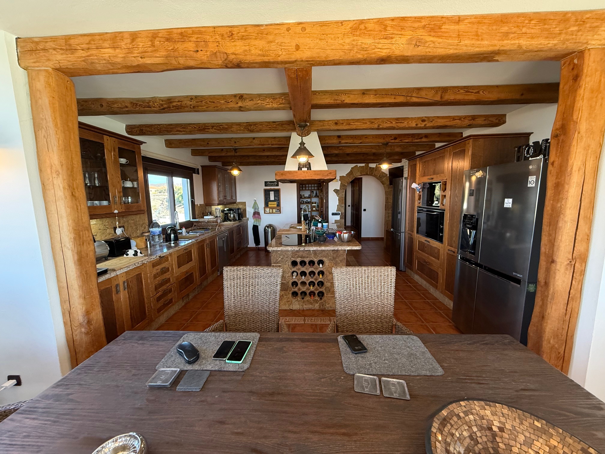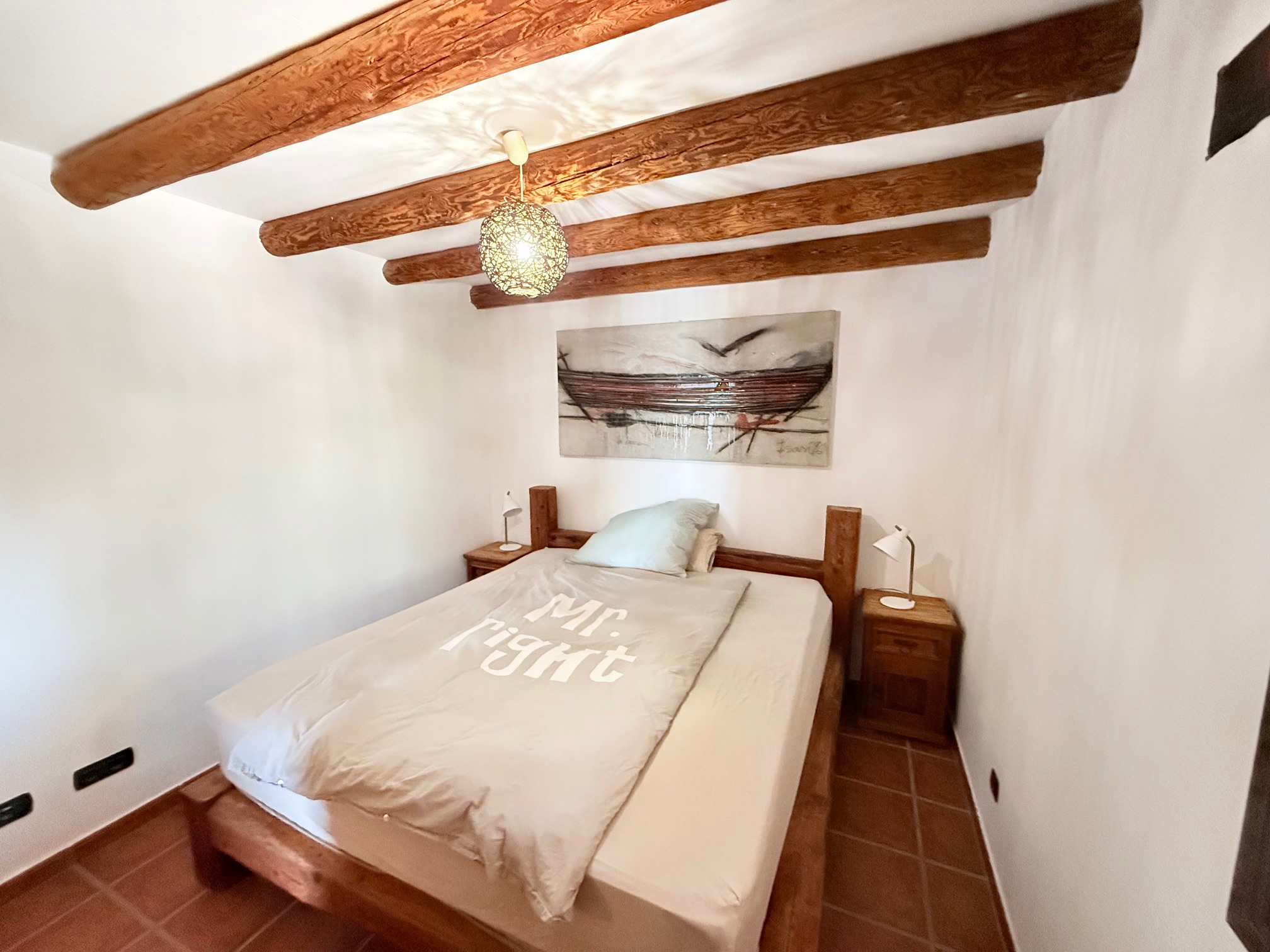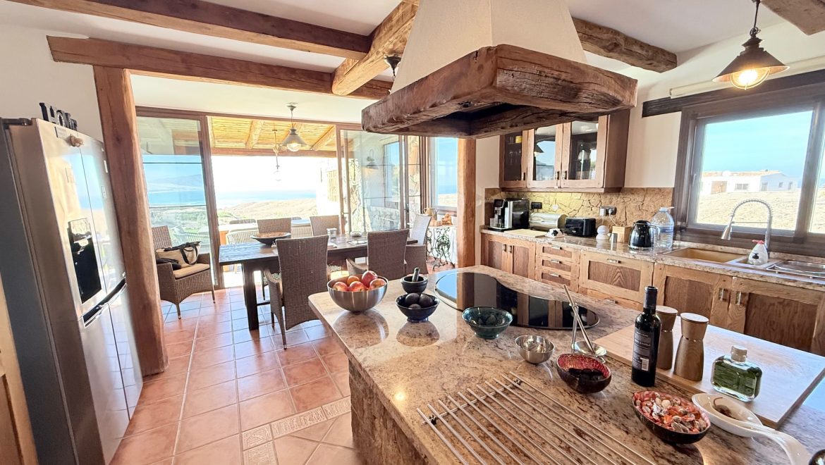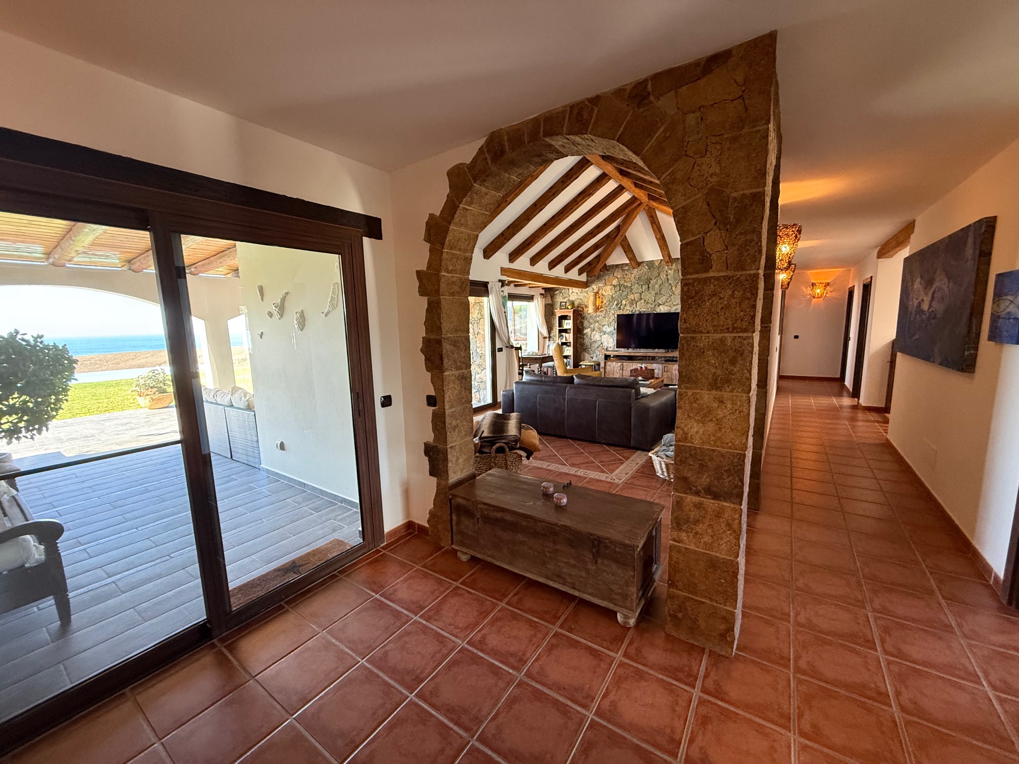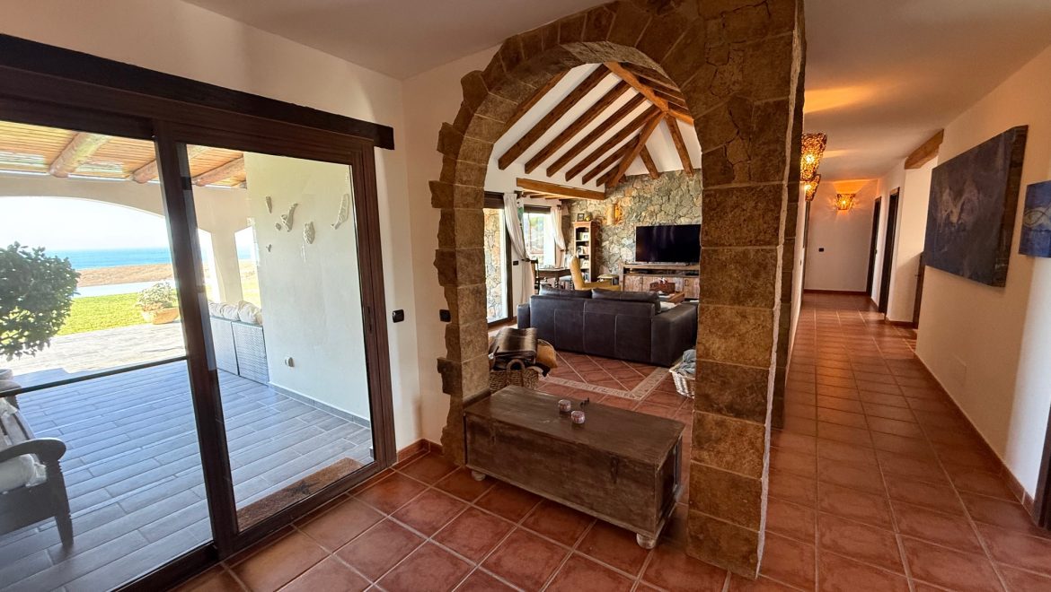 - Geräumiges Wohnzimmer mit tollen Holzbalken und Natursteinwand sowie offenen Kamin, Zugang zur Terrasse, Meerblick