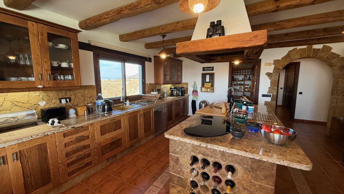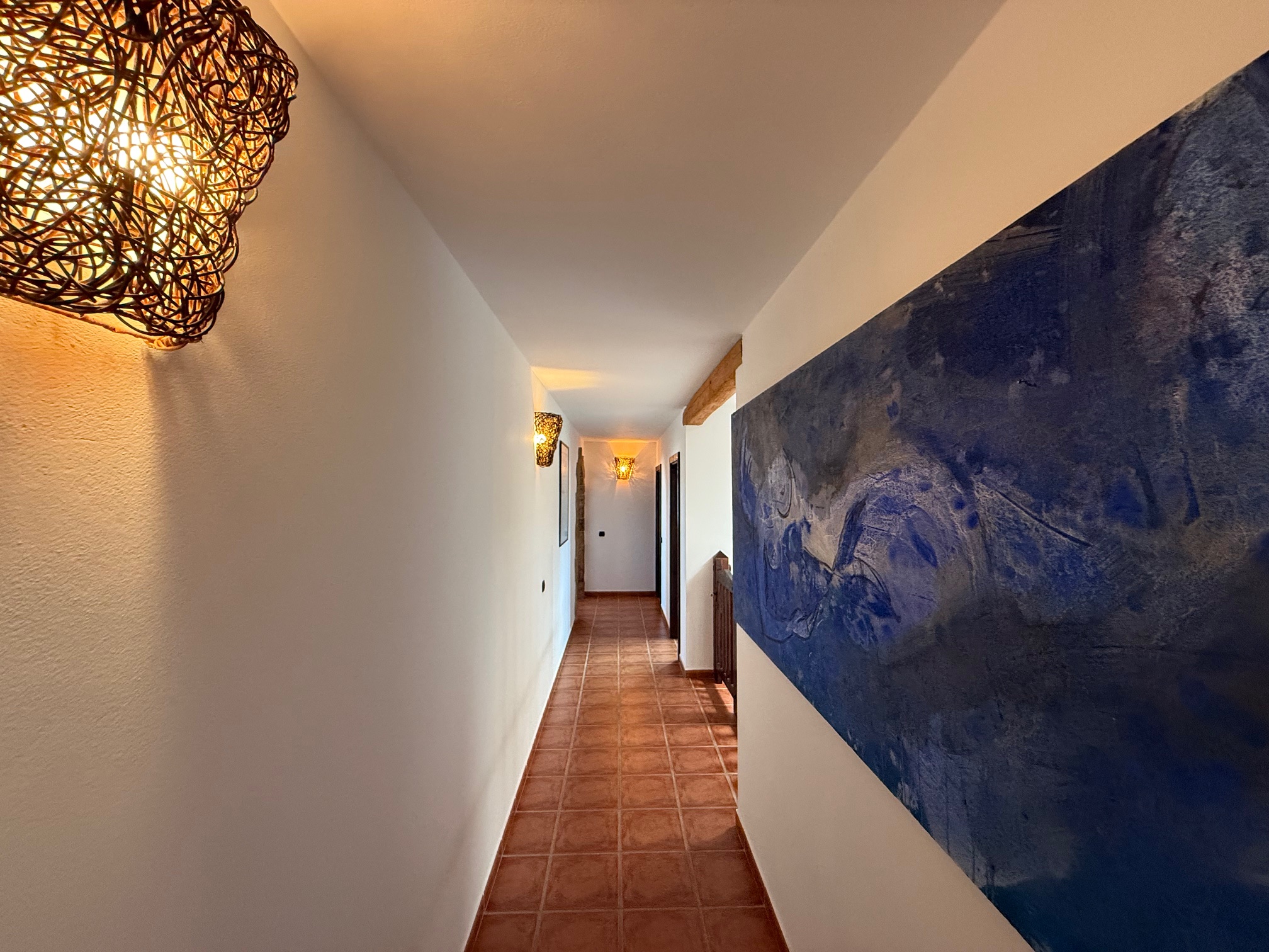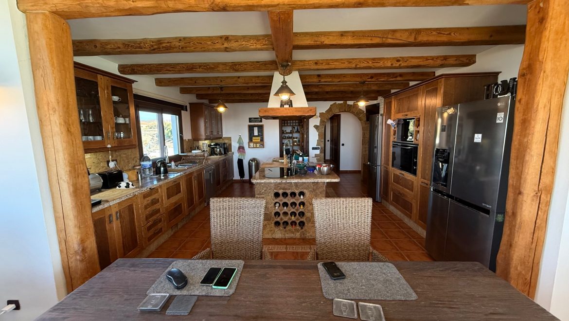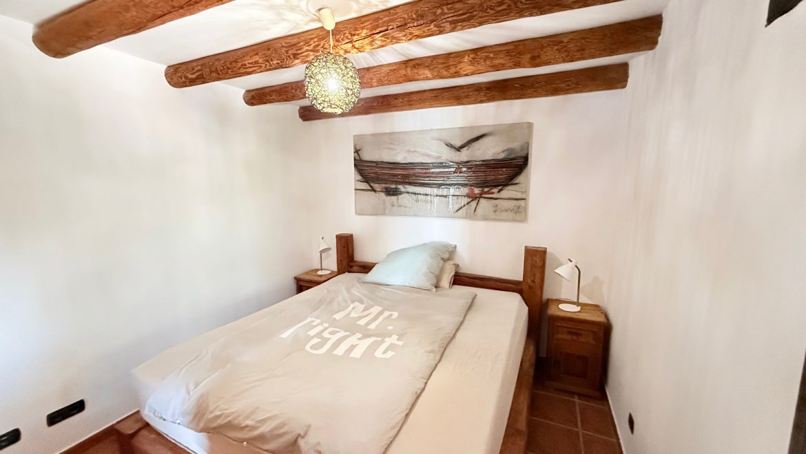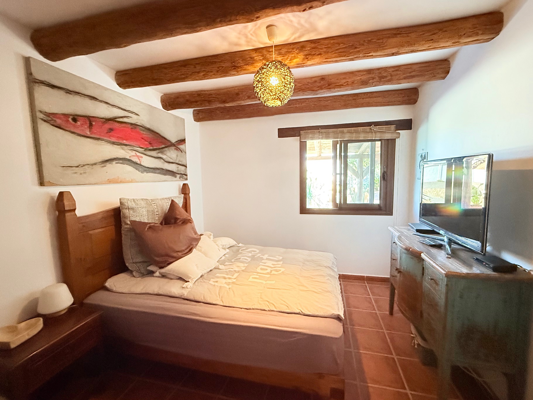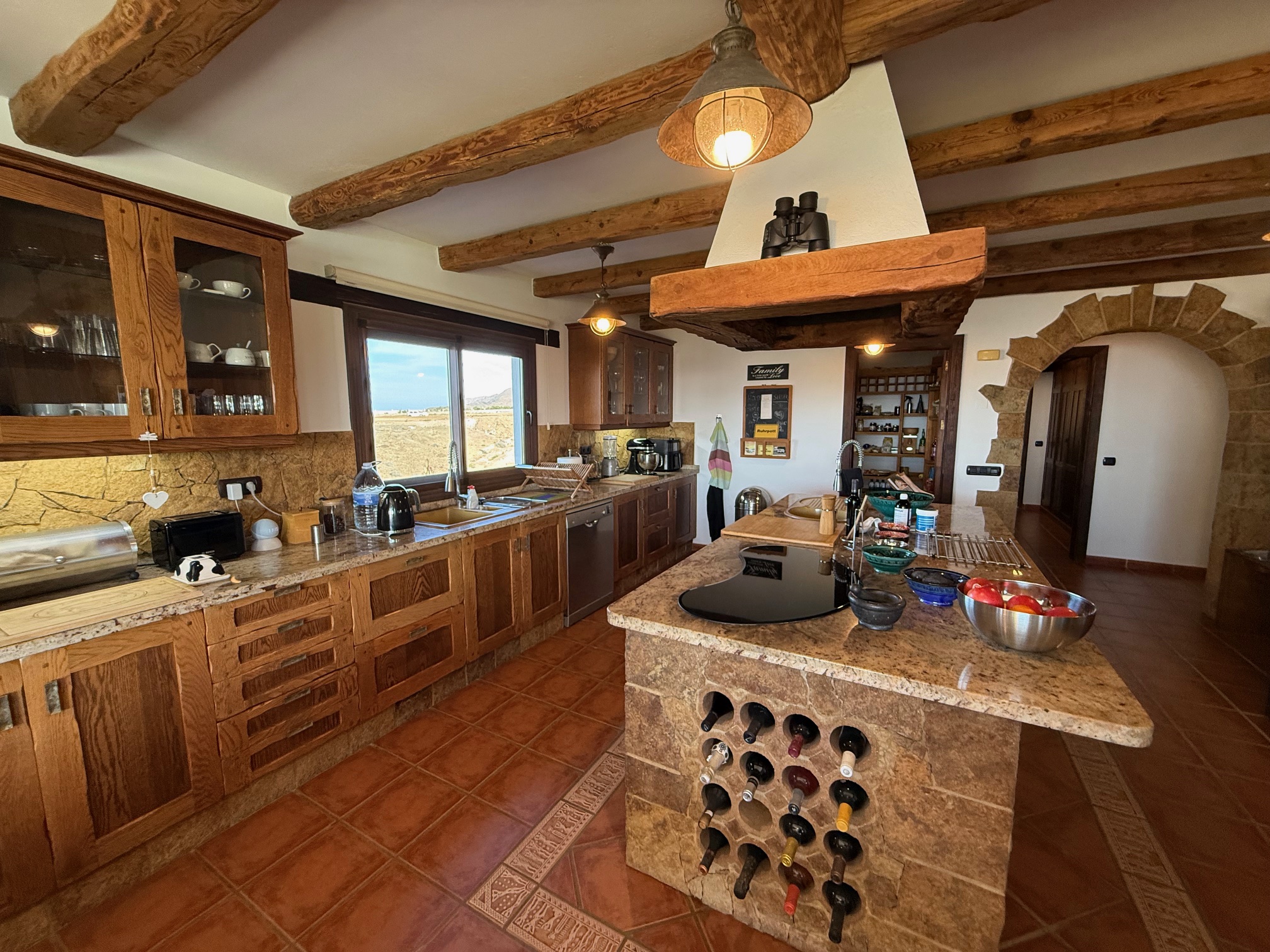 - Geräumiges Wohnzimmer mit tollen Holzbalken und Natursteinwand sowie offenen Kamin, Zugang zur Terrasse, Meerblick