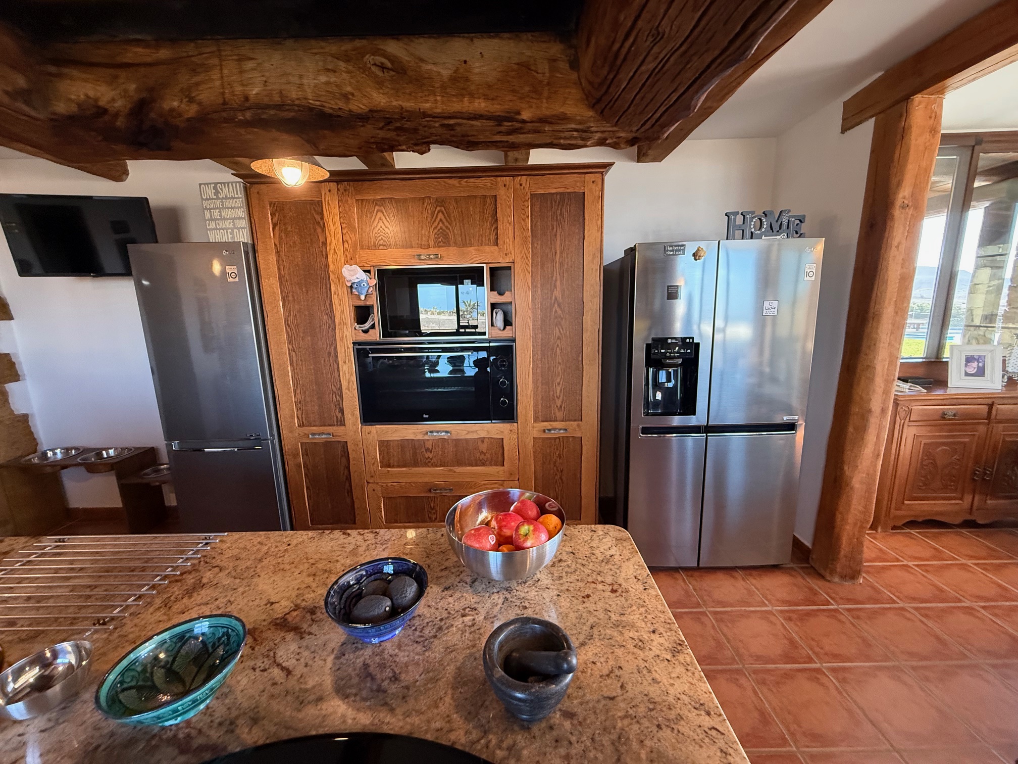 - Küche: Kochinsel in Natursteinoptik mit Ceranfeld und Dunstabzugshaube, Backofen, Mikrowelle, Geschirrspülmaschine, TV Gerät,